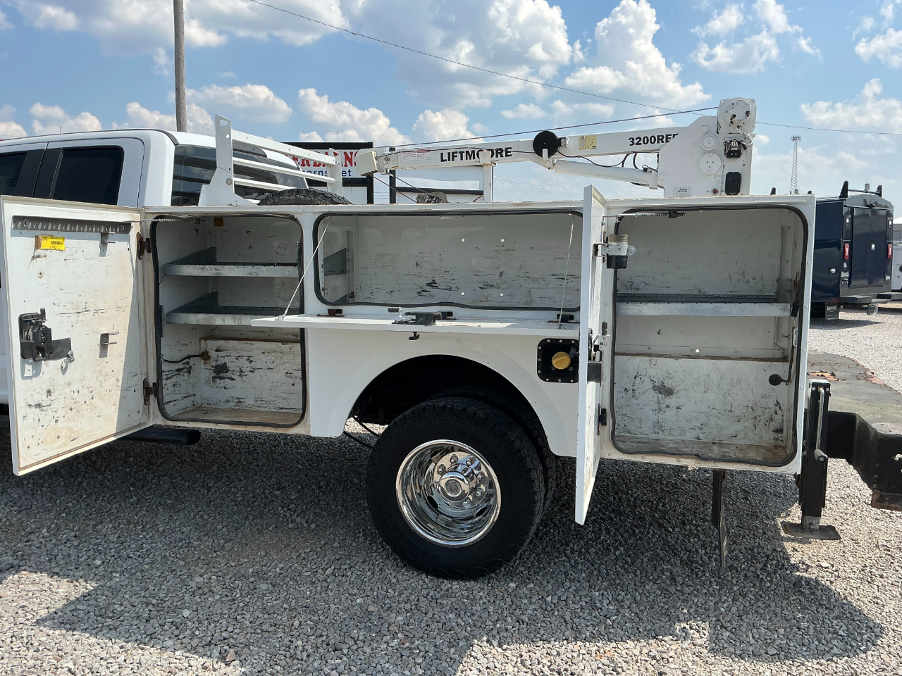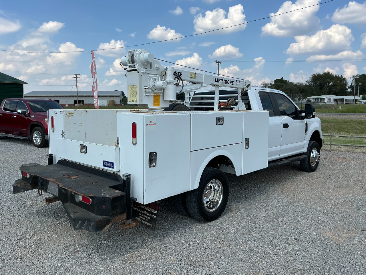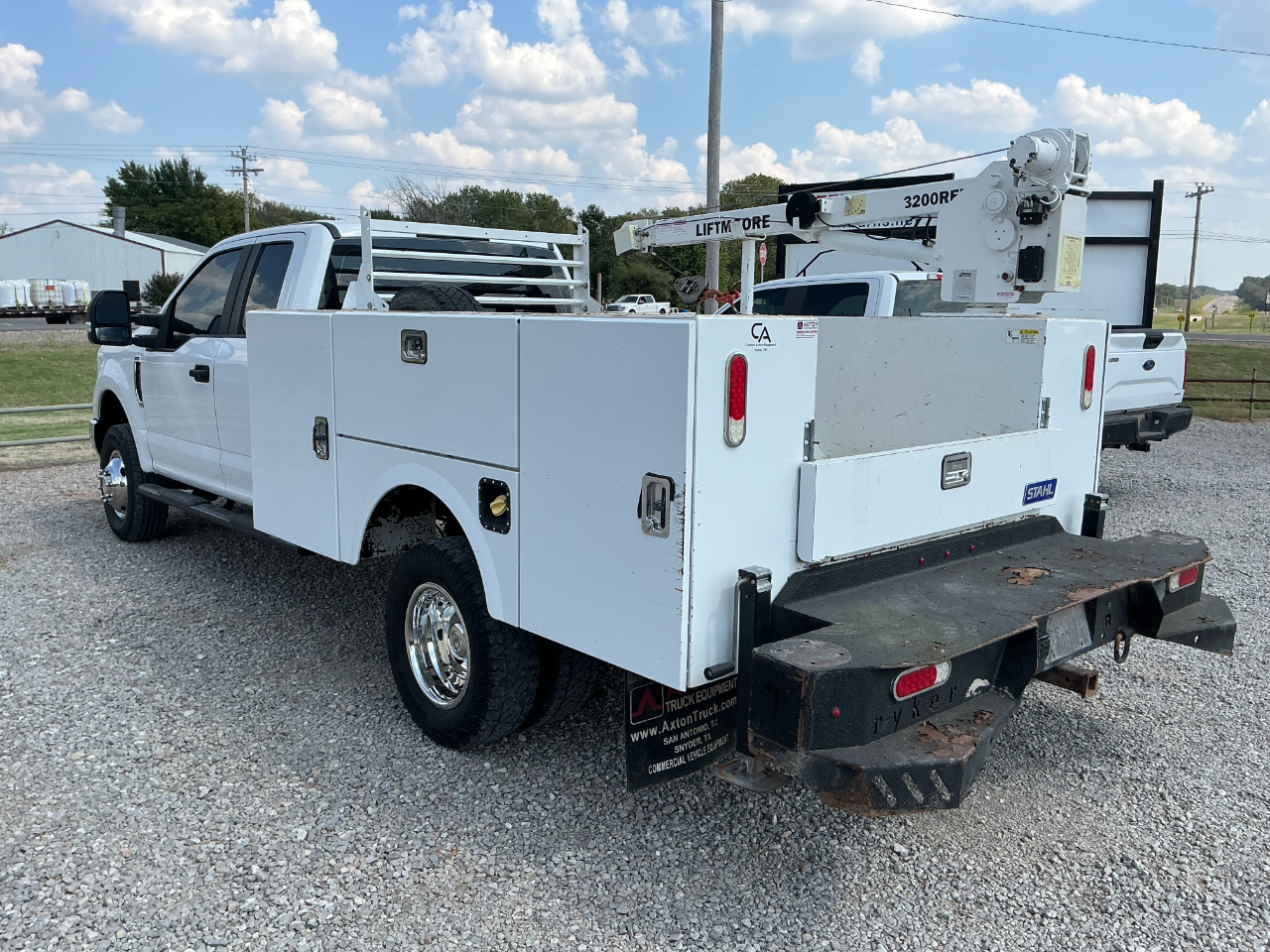 2019 FORD F350 EXTENDED CAB DUALLY, 6.2L GAS V8 AND AUTOMATIC AND 4WD, VINYL SEATS AND FLOORS, POWER WINDOWS AND LOCKS, CRUISE, BLUETOOTH BACK UP CAMERA, AUX SWITCHES, TRAILER BRAKE CONTROL, HAS A STAHL SERVICE BED WITH 3200LB LIFTMORE CRANE, HAS 110K MILES