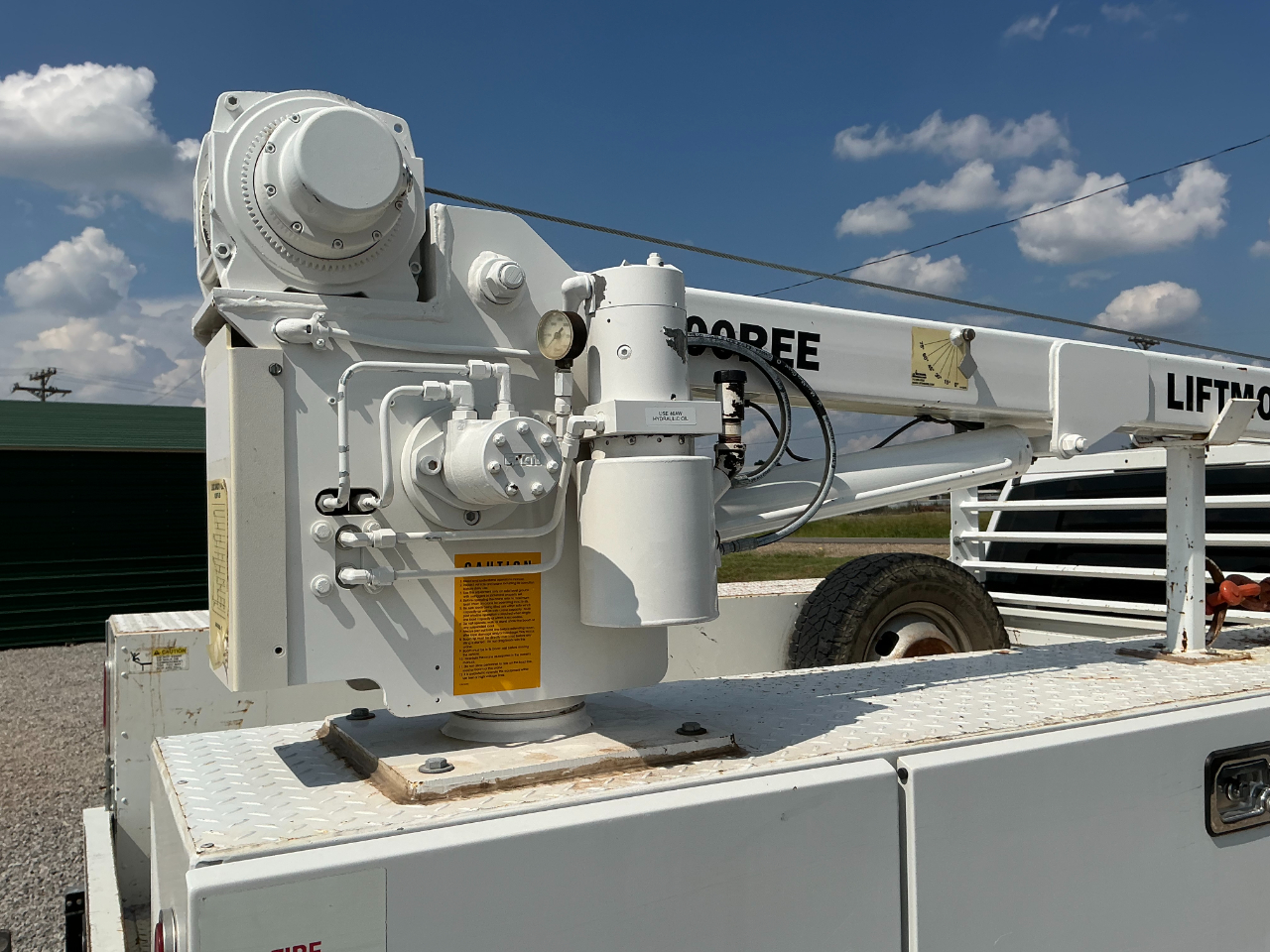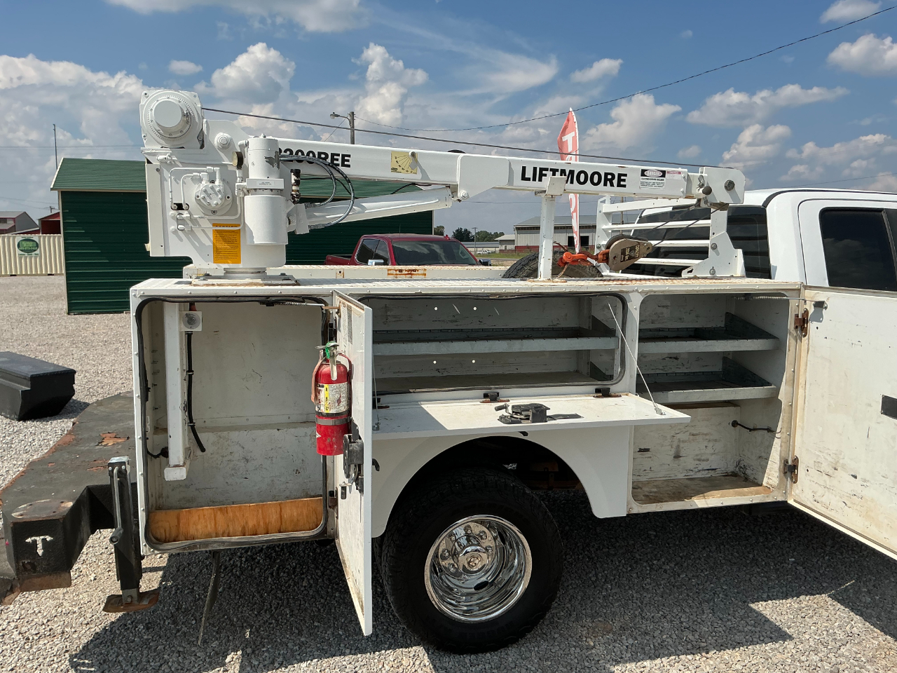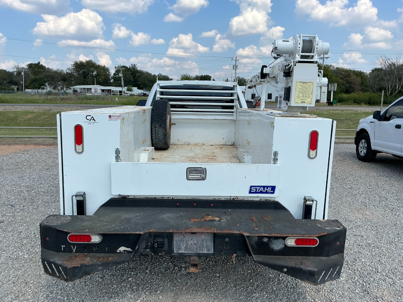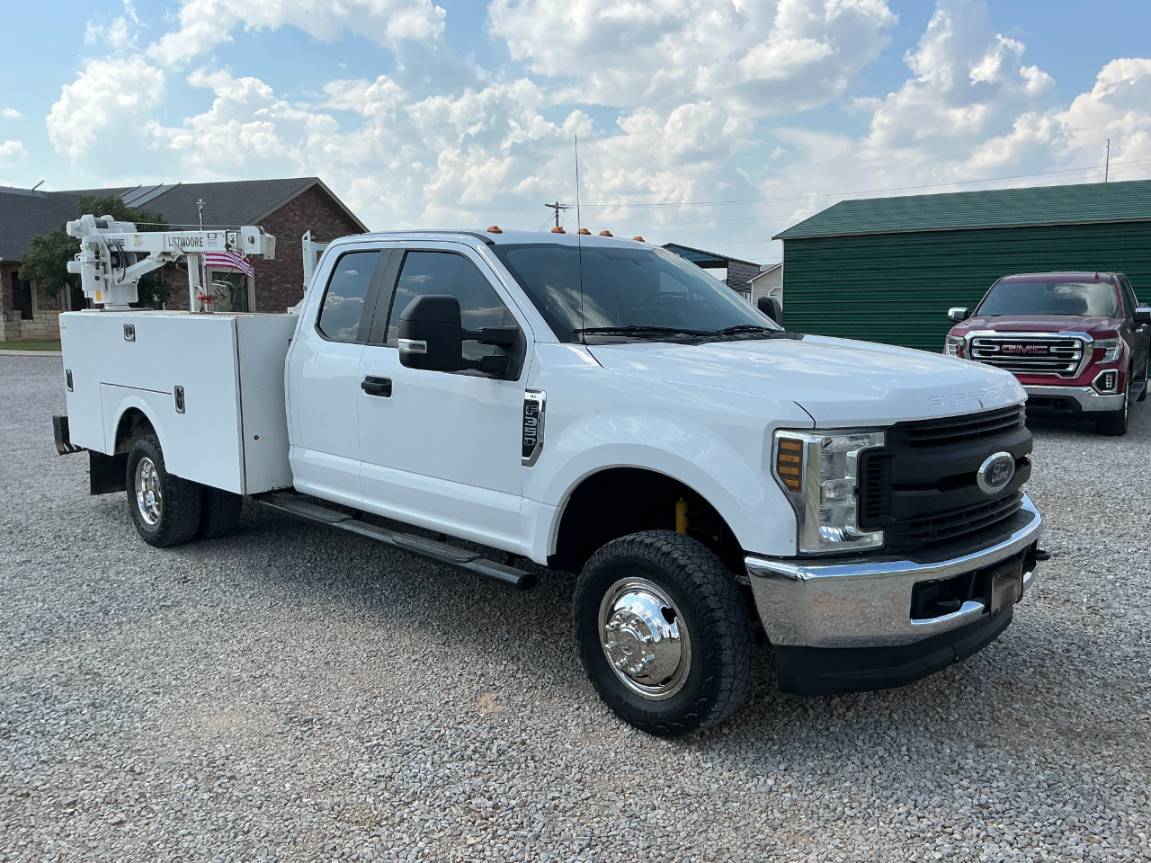 2019 FORD F350 EXTENDED CAB DUALLY, 6.2L GAS V8 AND AUTOMATIC AND 4WD, VINYL SEATS AND FLOORS, POWER WINDOWS AND LOCKS, CRUISE, BLUETOOTH BACK UP CAMERA, AUX SWITCHES, TRAILER BRAKE CONTROL, HAS A STAHL SERVICE BED WITH 3200LB LIFTMORE CRANE, HAS 110K MILES