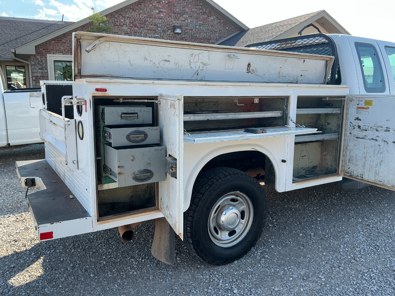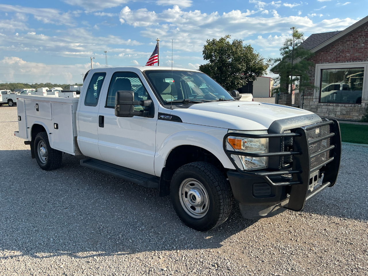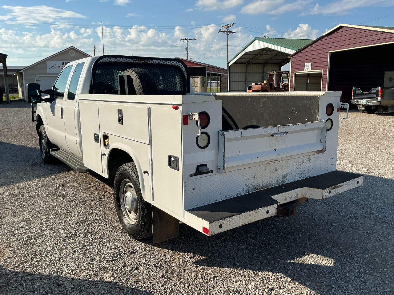 2015 FORD F350 EXTENDED CAB LONGBED SRW, 6.2L GAS V8 AND 4WD, XL PACKAGE WITH MANUAL WINDOWS AND LOCKS, CRUISE, AUX SWITCHES, TRAILER BRAKE CONTROL, HAS A RANCH HAND GRILL GUARD, KNAPHEIDE SERVICE BED WITH TOP BOXES, HAS 149K MILES