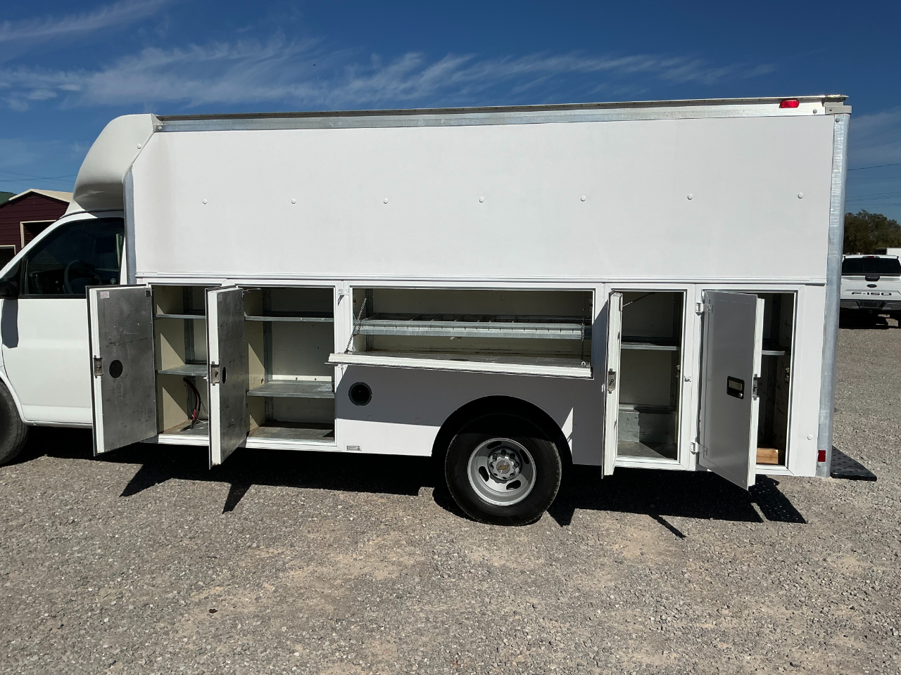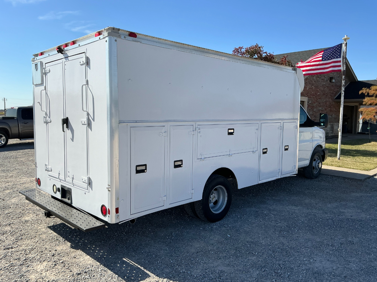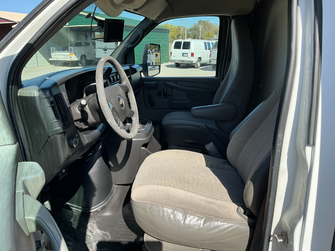 2012 CHEVROLET 3500 EXPRESS DUALLY, 6.0L GAS V8 AND RWD, CLOTH SEATS, MANUAL WINDOWS AND LOCKS, BACK UP CAMERA, TOW PACKAGE, HAS A SUPREME WORK BODY BED WITH UTILITY BED SIDE COMPARTMENTS, VERY CLEAN AND RUNS GREAT HAS 115K MILES